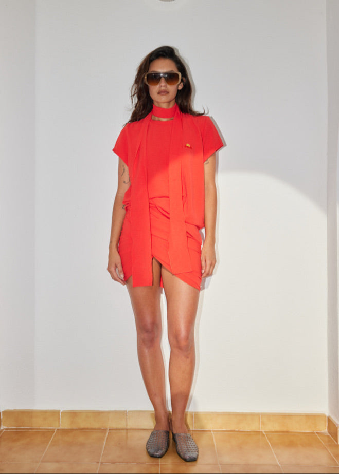 Couple ample mais ajustée, aisselle dégagée col légèrement flottant, petite fente coté.